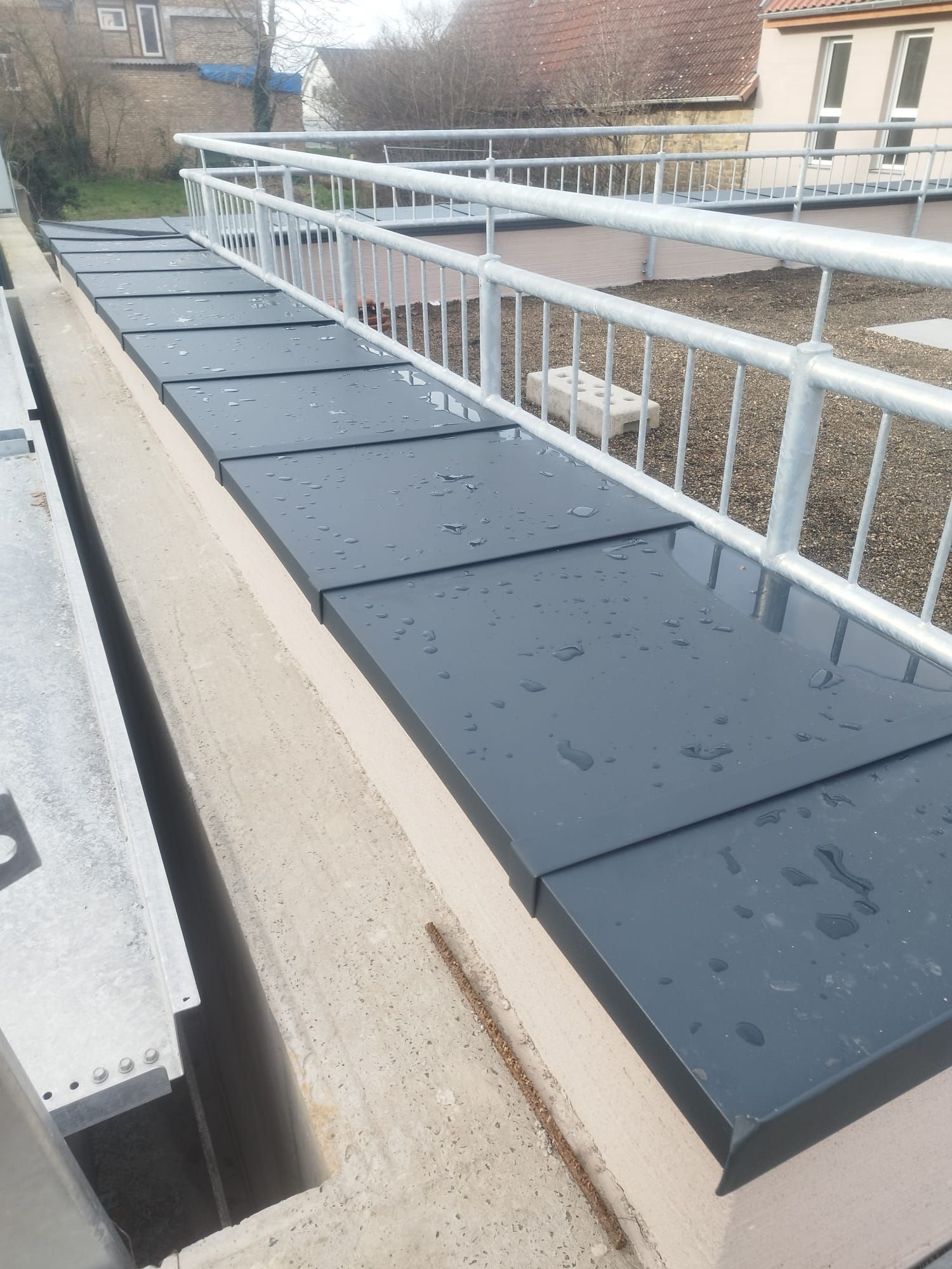 Aus einem alten Betonvorsprung wird ein modernes Vordach anhand von Verblendungen aus Blech.